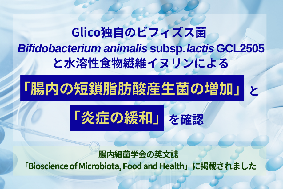 江崎グリコ株式会社は当社独自のビフィズス菌Bifidobacterium animalis subsp. lactis GCL2505(以下、GCL2505株)と水溶性食物繊維イヌリンによる腸内の短鎖脂肪酸産生菌の増加と、炎症の緩和効果を確認しました。本研究成果は腸内細菌学会の英文誌「Bioscience of Microbiota, Food and Health」に受理され、2025年12月4日(木)にオンラインで先行公開されました。当社は「タンサⓇ脂肪酸プロジェクト」として短鎖脂肪酸の研究と啓発活動を積極的に進めており、今後もGCL2505株と短鎖脂肪酸の可能性を探ってまいります。
