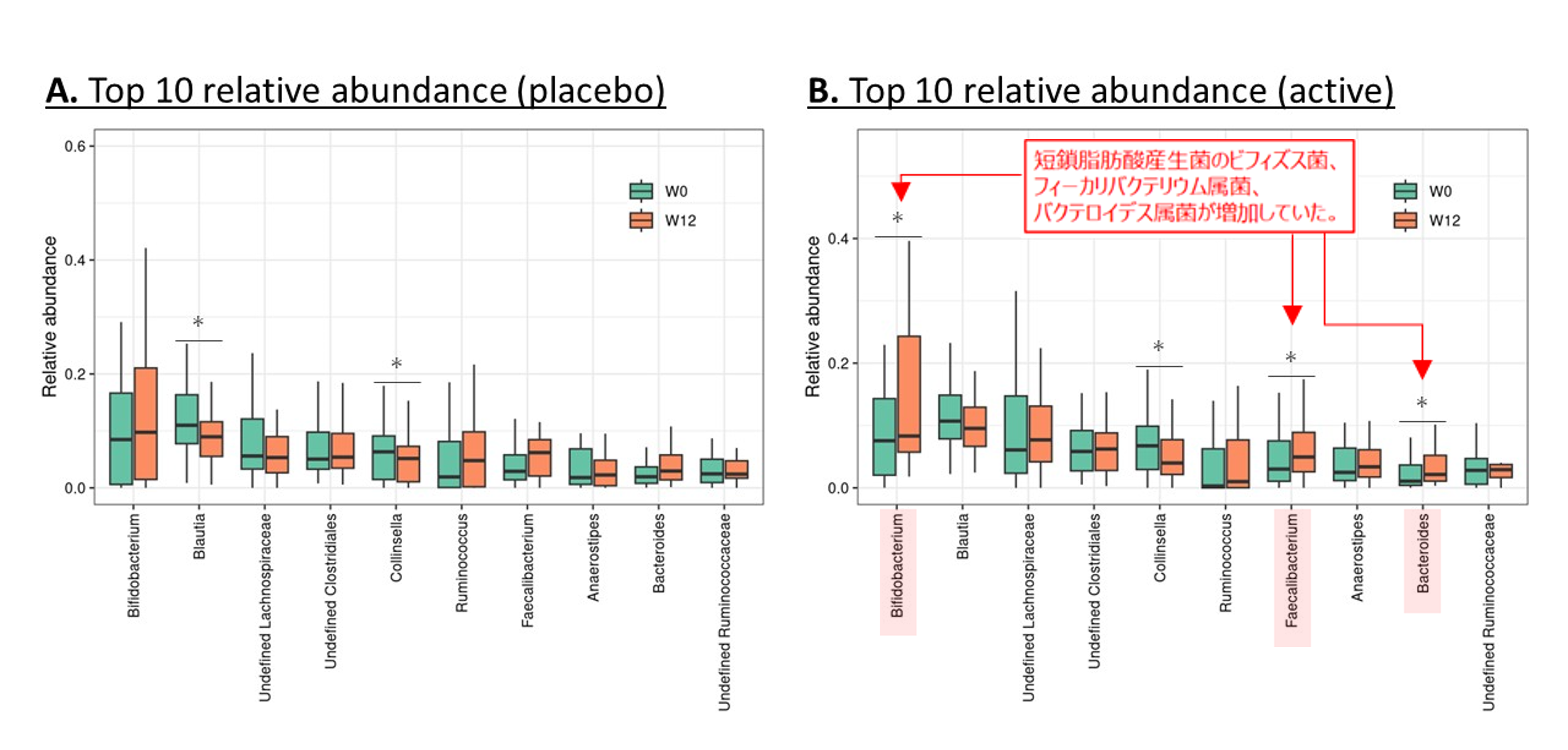 図1. 腸内細菌叢解析結果抜粋(A:プラセボ群、B:GCL2505+イヌリン摂取群)